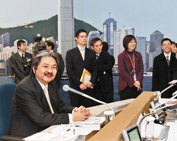 “资料图:2008年2月27日”二月二十七日,香港财政司司长曾俊华向立法会提交二零零八至零九年度财政预算案后举行记者会,回答传媒发问。 中新社发 邓庆乐 摄