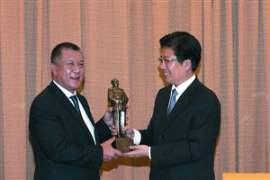 张春贤向何厚铧致送毛泽东铜像。(图片来源:澳门日报)