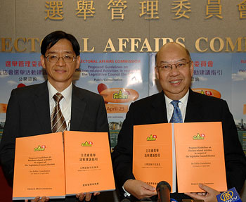 香港选举管理委员会委员陈志辉(左)及主席彭键基发表《立法会选举活动建议指引》公众咨询。(图片来源:香港特区政府网站)