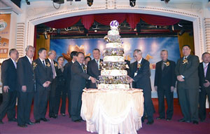 主礼嘉宾在侨总各负责人陪同下主持切蛋糕仪式。(澳门日报)