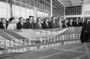 中新网4月21日电 据澳门日报报道,由广西壮族自治区党委书记郭声琨率领的访澳招商考察代表团一行,20日上午10时许经外港码头抵澳,澳门经济财政司司长谭伯源、澳门广西社团联合总会会长何玉棠、澳门广西总商会会长罗盛宗,以及两个总会约500名会员、乡亲,在场欢迎广西代表团的到来。