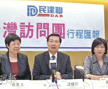 香港民建联主席谭耀宗(中)总结访台行程。左为蔡素玉,右为蒋丽芸。(图片来源:明报)