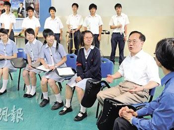 曾荫权(右)与家长及学生就教育问题交换意见。(图片来源:明报)