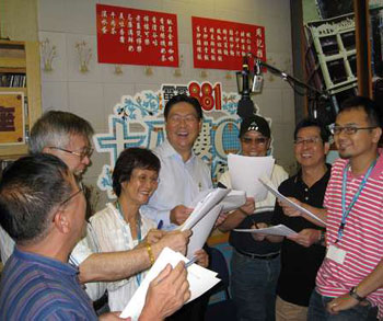 图:马时亨(中)客串电台节目。(图片来源:大公报)
