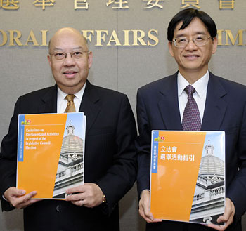 香港选举管理委员会主席彭键基(左)公布立法会选举活动指引,并促请候选人熟读指引。(图片来源:香港特区政府网站)