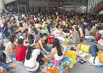 资料图:每当周末﹐菲佣们便三五人、几十人集中在一起﹐聚餐、聊天﹐享受她们自己的生活。 中新社发 王丽南 摄
