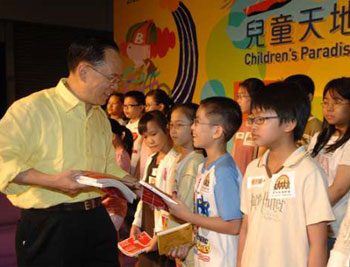 中新网7月28日电 据香港大公报报道,刚结束东北三省访问的行政长官曾荫权,昨天与18名儿童一同到香港书展看书,期间与他们畅谈“开卷之乐”。