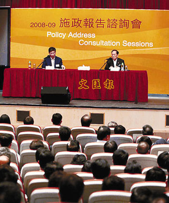 针对民生问题,曾荫权强调:“香港竞争法、医疗融资、最低工资立法、广播政策、生果金检讨等多个大型民生政策均会在2008-2009年度,特别是2009年诞生。”至于政制方面,他则说,普选时间表已经定下,2012年的选举办法需要深入讨论,将在明年开展有关工作。