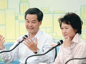 行政会议成员梁振英(左)近日经常谈及香港面对两岸三通时的挑战和机遇,他9日在《城市论坛》中认为香港官员应加强与台湾官员交流。右为香江文化交流基金会主席江素惠。(图片来源:明报)