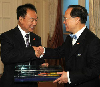 曾荫权送赠纪念礼盒给代表团团长张建启。纪念礼盒载有代表团在港活动的录像光盘及相片。(图片来源:香港特区政府网站)