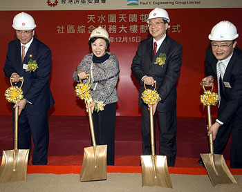 郑汝桦15日在天水围天晴村主持天晴社区综合服务大楼动土仪式时表示,房屋委员会将加快建筑和维修保养工程以创造就业机会,并继续致力协助低收入家庭解决住屋需要。