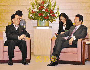 2月16日,香港特别行政区行政长官曾荫权开始对日本的正式访问。这是他就任特首以来首次访日,受到日本政经各界的欢迎。图为16日傍晚,曾荫权在东京与日本外相中曾根弘文举行会谈。 中新社发 朱沿华 摄