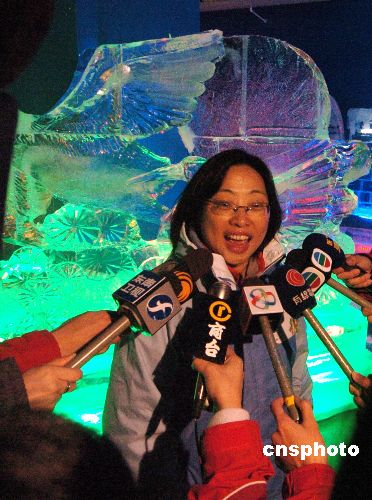 2006年7月10日,香港传媒在太古城商场零下5度的展馆内,率先观赏来自哈尔滨冰灯艺术,工艺师现场赶制造型各异、色彩夺目的冰灯,准备在13日向香港市民呈献超凡雕工。中新社传真洪少葵摄 中新社发 洪少葵 摄