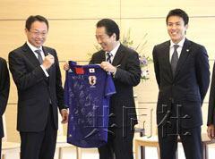 中新网7月6日电 据日本共同社网站报道,日本男足主帅冈田武史(53岁)及部分球员6日前往日本首相官邸拜访首相菅直人。菅直人对日本男足给予了高度评价。