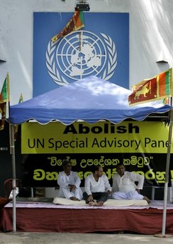 中新网7月8日电 据外电报道,斯里兰卡对联合国展开针对其战争罪调查的抗议已经进入了第3天。7月8日,在斯里兰卡政府部长维拉万萨带领下,示威者开始在联合国驻斯里兰卡办事处外举行绝食抗议,声称联合国如不停止对斯国战争罪调查,他们就一直不吃不喝,直到死去为止。