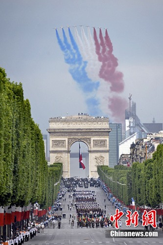 中新社巴黎7月14日电(记者 卫中)14日是法国国庆日,该国冒着大雨在巴黎香榭丽舍大道上举行了传统的阅兵仪式。近30名旅法华侨华人代表受邀观礼。