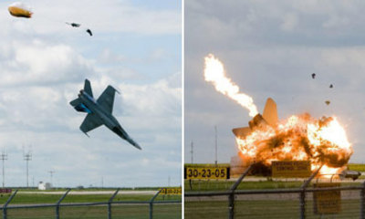 据悉,这架战机是在做超低空飞行动作时坠毁的。目击者说,飞行员是在飞机离地面30米处被弹出机舱,拉开降落伞成功逃生。