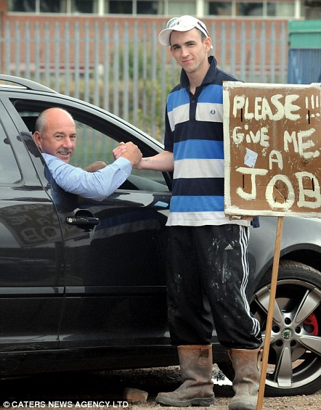 中新网7月26日电 据英国媒体26日报道,23岁的英国青年马克•威尔顿近日举着一块自制的木牌,站在英国最繁华的特伦特河畔斯多克市为自己做起广告。牌子上写着“请给我份工作”。
