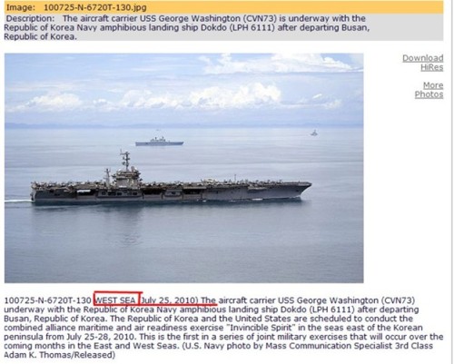 记者于7月28日再次登录美国海军官方网站,发现之前被标为拍摄于“西海”(中国称“黄海”)并在7月27日被删除的照片,已经再度被上传到网站上,而其标注的地点已经被更正为“日本海”。