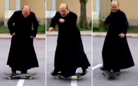 报道称,身着牧师装的佐尔坦在匈牙利邻近斯洛文尼亚的一个村庄教堂前大秀他的滑板技巧,娴熟的展示着这个只在青少年人群中风靡的运动。
