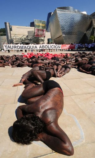 中新网8月23日电 据“中国时报”报道,大约100人上周末在西班牙北部城市比尔包的古根汉美术馆外裸体抗议斗牛活动。