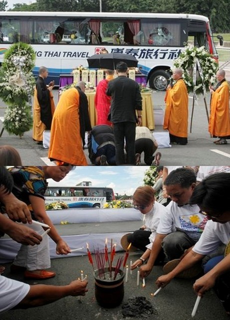 中新网8月25日电 综合媒体报道,8月25日,是菲律宾所定的全国哀悼日,菲律宾人将与中国人一道,悼念在菲人质劫持事件中遇难的中国香港游客。港府从24日至26日,连续三天为菲律宾人质事件遇难者下半旗志哀。在菲律宾,民众前往黎刹公园事发现场给遇难者献花,气氛凝重;遇难者家属24日举行路祭,场面催人泪下。