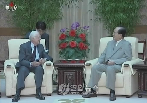 报道称,金永南和卡特在温馨的氛围里进行了交谈。六方会谈朝鲜代表团长金桂冠等人出席了会晤。