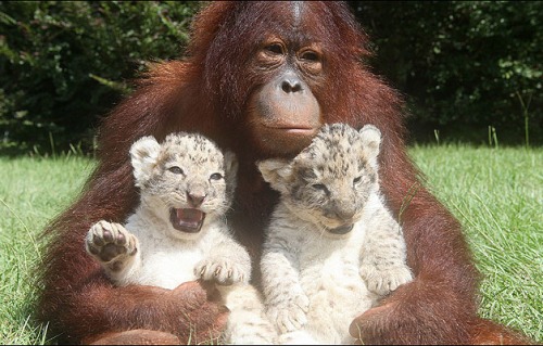 据英国《太阳报》消息,美国南卡罗来纳州默特尔海滨野生动物园,一只红毛大猩猩收养了两只小白狮,并与它们嬉戏,温馨场景吸引了许多游客驻足观看。画面显示,红毛猩猩欢快地躺在地上,伸出双臂将两只可爱的小狮子搂在怀中,满足之感和幸福之情溢于言表。