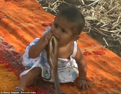 中新网9月8日电 据台湾“今日新闻网”8日报道,印度一名农夫因没钱买玩具,竟用蟒蛇代替玩具,让刚6个月大的女婴和蛇一起玩耍,大胆的女婴还用嘴去咬蛇的尾巴,让人看了不禁为她捏一把冷汗。不过,她的爸爸一点也不担心,说女儿和蛇很“投缘”。