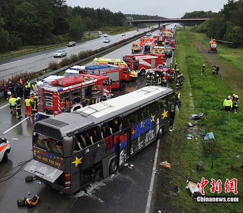 中新网9月27日电 据外电报道,当地时间26日,在柏林南部的叙纳菲尔德区发生了一起严重的交通事故。一辆由西班牙返回的波兰旅行大轿车与一辆小汽车相撞后撞在了桥墩上,造成13人死亡。