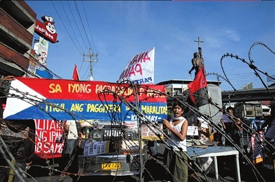 28日,遭强制拆迁的菲律宾民众在菲总统府外倒挂国旗,集会抗议政府强制拆迁首都马尼拉的贫民窟。
