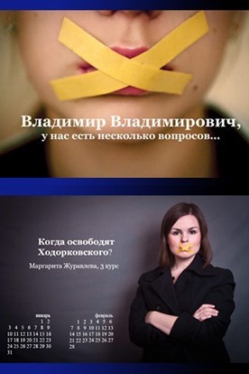 俄媒报道称,此次的“另类”日历照同样来自莫斯科大学新闻系女学生。照片上的女大学生不再暴露身体,而是身着黑色套装。令人注意的是,她们的嘴都用黄色胶条封住。每个日历照都有女大学生向普京提出的自己无法理解或无法接受的问题。比如,有女学生写道:“何时释放霍多尔科夫斯基(其被视为普京宿敌)?”