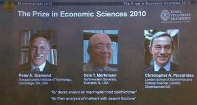 中新网10月11日电 据外电报道,瑞典皇家学院11日宣布,美国经济学家彼得·戴蒙德(Peter A. Diamond)、戴尔·默藤森(Dale T. Mortensen),塞浦路斯裔、英籍经济学家克里斯托弗·皮萨里德斯(Christopher A. Pissarides)三位学者共同获得2010年诺贝尔经济学奖。