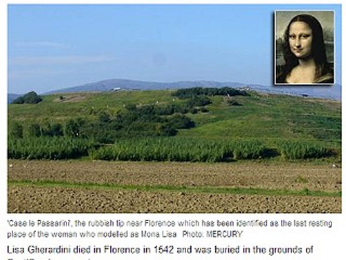 如今被指为莉萨遗骨的倾倒处,是个小丘陵地。帕兰提着有《揭开蒙娜丽莎的面纱》(Mona Lisa Revealed),他表示,“遗憾的是,莉萨的墓穴被毁的当时,没人知道里面埋的是谁。”2007年,他宣称在佛罗伦萨一座教堂档案里,找到莉萨的死亡证明。
