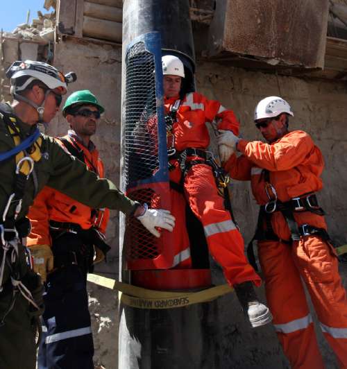 搭载受困矿工升井的是海军特制救生舱“凤凰号”,意欲矿工在脱困后“重生”。救生舱仅及肩宽,两端分别装有8个导向减震轮。舱内将安装一架摄影机,镜头将聚焦矿工脸部及氧气罩与双向沟通器,设计升降速度为每秒1米。如果在升回地面期间出现险情,矿工可以脱离救生舱,借助滑轮慢慢返回地底。