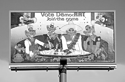 一幅位于美国科罗拉多州梅萨县的大型选举广告牌惹来争议。该广告牌将奥巴马描绘成伊斯兰自杀式炸弹袭击狂徒、同性恋者、抽雪茄的歹徒和墨西哥土匪,并画上几只身上写上律师、美国国家税务局(IRS)、国家环境保护署(EPA)和美联储的大老鼠,讽刺他们和奥巴马蛇鼠一窝。