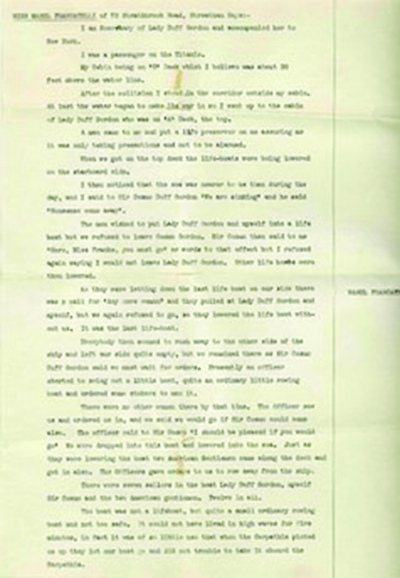 提供证词的幸存者名为劳拉·弗朗凯特莉,1912年“泰坦尼克”号沉没时31岁,1967年去世。这份证词当年呈交英国调查委员会,详细陈述一些幸存者的逃生经历。在证词中,弗朗凯特莉回忆了她和其他一些幸存者搭乘一艘救生艇逃生的经过。证词写道,“‘泰坦尼克’号沉下去的时候,我们已经滑了很远。船沉没时,传来令人惊恐的声响,接着是尖叫声和哭喊声……我们周围一片黑暗”。