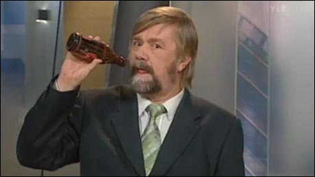 这名男主播名为威斯卡(Kimmo Wilska),他当天一脸睡眼惺忪地坐在主播台上播报酒架违章的新闻,随即屏幕切进酒吧售酒的画面,没想到下一秒观众就看到这位男主播拿着酒瓶往嘴里送,但他机警地发现了镜头在拍他,露出一脸尴尬笑容,马上放下了酒瓶若无其事继续播报新闻。