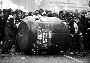 在里昂等城市,许多中学生放火焚烧汽车。在法国西北部,19日上午也有一所学校起火,起火原因是很明显的纵火。