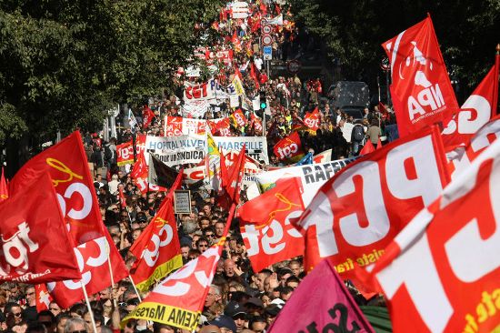 在萨科奇的亲自推动下,法国这一轮的退休制度改革搞得如火如荼,总理菲永领导下的内阁所提出的改革方案中最重要的内容,已经在9月份获得法国国民议会(众议院)通过,参议院也已经在本月8日通过了提高退休年龄的法案,其余部分将在今日进行最后表决。法国工会和学生发起声势浩大的全国性罢工和示威,就是想赶着表决之前,尽最大的努力加以阻止,就像1995年的那次致使全国交通运输系统瘫痪的大罢工,最终迫使希拉克政府不得不取消了养老金改革。
