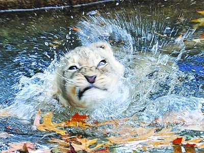 这个小家伙可一点也不高兴。虽然工作人员尽量温柔,拎着它的脖子轻轻地放进水里,狮崽也没有领情。动物园的工作人员并非无聊生事。他们只是想测试园里的4头小狮子是否会游泳,从而确定动物园的水渠不会对它们造成威胁。这条水渠正好环绕在狮园四周,如果这些小兽们能够游过水渠,它们就可以和自己的母亲一起“接待”动物园的游客了。4个小家伙一个个地接受了测试,而它们的反应也很一致,都对下水深恶痛绝。 曹玥