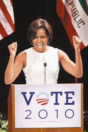 中新网11月1日电 据香港《文汇报》网站报道,美国中期选举11月2日举行,被视为民主党秘密武器的美国第一夫人米歇尔.奥巴马也尽最后努力拉票。她连日穿梭美国西岸各个州,以“慈母”形象为不同候选人站台,很受选民欢迎。政治分析家认为,米歇尔的亲和形象,有助于推动未定投票取向的选民为民主党投票。