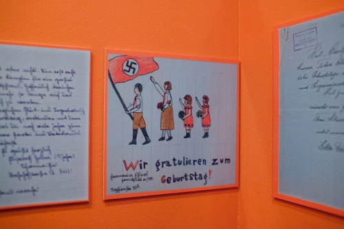 展品中有1932年希特勒生日时孩子们写给他的热情洋溢的信,信里还带着插画。另外还有一幅新教徒妇女团体编织的巨大挂毯,上面有纳粹图案和圣像图案。这些展品说明,是民众发自内心的敬仰将这位其貌不扬的人物从极右边缘推到了权力的中心。