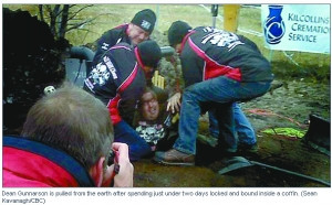 据《多伦多太阳报》11月3日报道,46岁的加拿大著名魔术师和逃生艺术家迪恩·贡纳森曾进行过多次绝地逃生的惊人表演。日前贡纳森又再次完成了另一项石破天惊的逃生表演———他将自己全身用链条捆绑锁牢并躺进一具钢制棺材内,然后被埋入地面以下2米的墓穴中,而棺材外面再用更多链条捆绑锁住。不可思议的是,在被“活埋”长达42小时之后,贡纳森竟然奇迹般地毫发无损,最终于10月31日万圣节当天破棺而出,成功脱身!(旺旺)