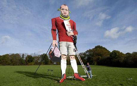 报道称,英国伊登布里奇篝火协会日前搭建出一座高49英尺(约15米)的钢架人像,而主角就是英国曼彻斯特联队的著名球星鲁尼。