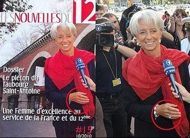 据英国《每日电讯报》报道,法国财政部长拉嘉德(Christine Lagarde)接受当地媒体采访,不过最终的杂志封面上却没有了拍照时所戴的珍珠耳环、手链、戒指等贵重首饰,这些都被用图像处理技术去除掉了。如此做法可以让她显得朴素而不致再度激发因养老金改革而高涨的民众情绪,也尽可能不让民众觉得她的奢华作风与她提倡的改革案不符。
