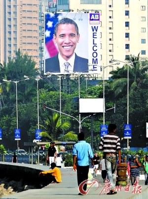 在孟买海边的一条人行道上,张贴着“欢迎奥巴马”的大幅海报。