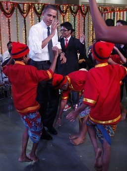 这些身穿鲜艳印度传统服装的孟买学生,当天为远道而来的客人表演庆祝排灯节的舞蹈,他们摇摆着身姿,配以优美的手势,感染着在场的观众。孩子们邀请奥巴马夫人米歇尔一起舞蹈,米歇尔热情的加入,奥巴马则在一旁静静观看。不过最后,奥巴马也被拉起来共舞,但有些呆板生硬的动作令人忍俊不禁。