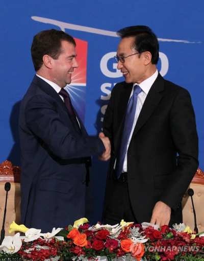 中新网11月10日电 据韩联社报道,韩国总统李明博和俄罗斯总统梅德韦杰夫10日举行首脑会谈,基于两国之间的战略合作伙伴关系,就两国关系的发展方案、主要的地区和国际问题深入交换意见,并于会后发表了《联合声明》。声明除了G20峰会和朝核等朝鲜半岛局势相关问题以外,还覆盖人员交流、媒体合作、基础设施建设等两国共同关心的问题。