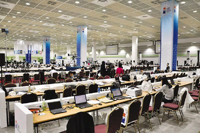 峰会会场COEX的新闻中心面积空前,主要分为电视和文字图片记者两个区域。工作人员表示,新闻中心设置1330个记者座位,另有132个电视转播亭。